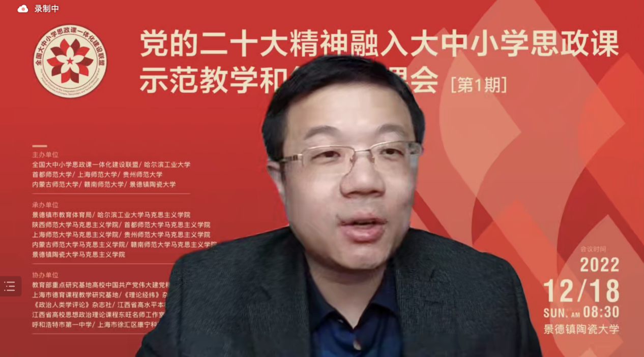 本网讯(兰茜 刘小清)12月18日,由景德镇陶瓷大学牵头,联合全国大中小学思政课一体化建设联盟、哈尔滨工业大学、首都师范大学、上海师范大学、贵州师范大学、内蒙古师范大请学、赣南师范大学共同主办,景德镇市教育体育局及8所高校马克思主义学院联合承办的党的二十大精神融入大中小学思政课示范教学和集体备课会(第一期)在线举行。