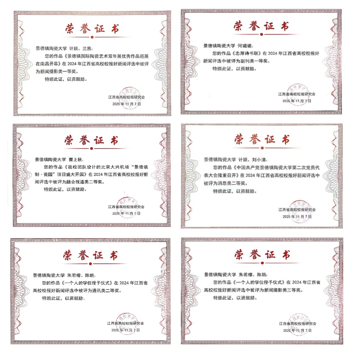 其中,我校选送的新闻作品《景德镇国际陶瓷艺术双年展优秀作品巡展在南昌开幕》(作者:计颖、兰茜)获新闻摄影类一等奖,《忠厚诗书联》(作者:何璐璐)获副刊类一等奖;《中国共产党景德镇陶瓷大学第二次党员代表大会隆重召开》(作者:计颖、刘小清)获消息类二等奖,《一个人的学位授予仪式》(作者:朱若檬、陈朗)获通讯类二等奖,《我校团队设计的北京大兴机场“景德镇制·瓷园”项目盛大开园》(作者:曹上秋)获融合报道类二等奖;《一个人的学位授予仪式》(作者:朱若檬、陈朗)获新闻摄影类三等奖,《家风如舟 德行如水》(作者:曾亮亮)获副刊类三等奖,《吕品昌教授与我校学生冯家宝分别荣获“中国美术奖”特别奖和铜奖》(作者:戚润亭)获消息类三等奖,《“润心馆”揭牌仪式暨“美术思政”学生作品展开幕式在湘湖校区举行》(作者:郭珍珍、袁浩)获消息类三等奖,《2024年10月31日第781期第04版:瓷苑副刊》(作者:刘小清)获版面类三等奖。