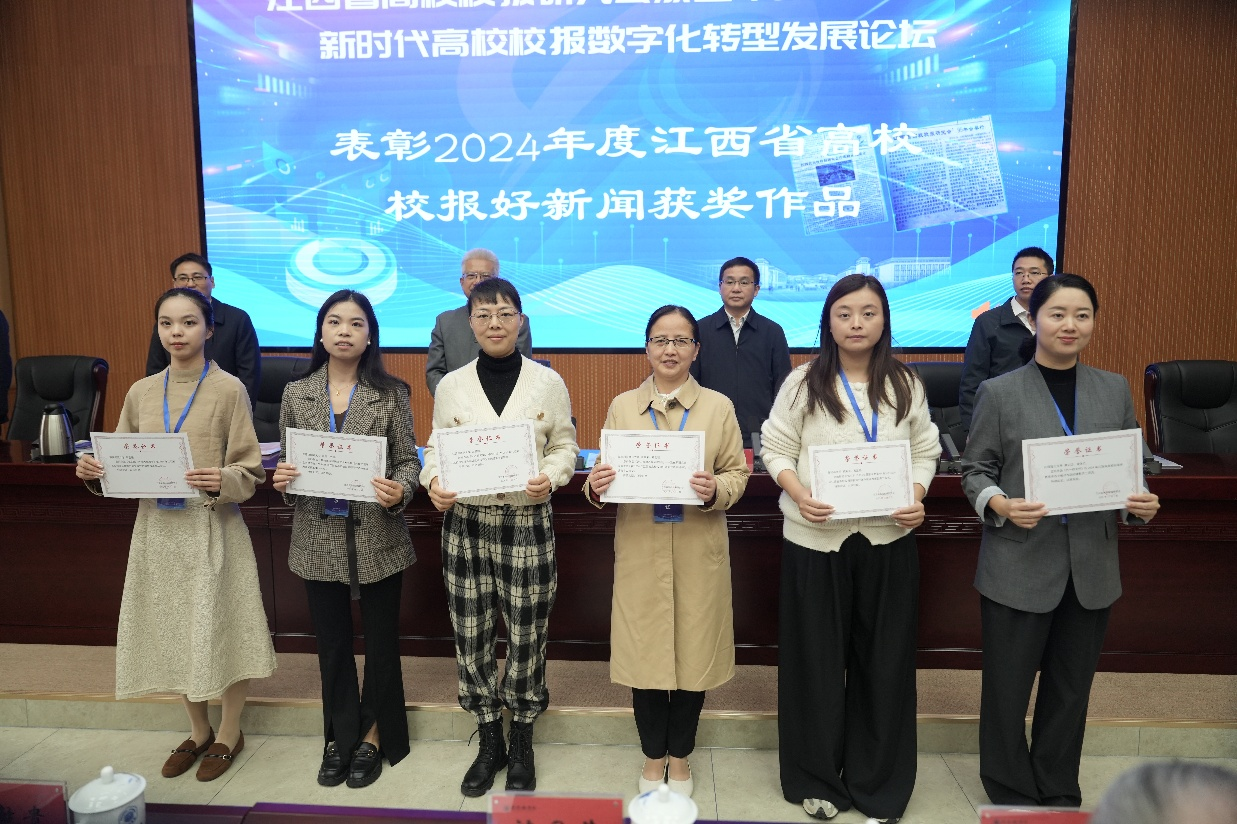 本网讯(帅隆妹)近日,由江西省高校校报研究会主办,江西中医药大学与景德镇学院联合承办的江西省高校校报研究会成立40周年回顾暨新时代高校校报数字化转型发展论坛在景德镇学院举办,来自全省各高校分管校领导、党委宣传部负责人、老报人代表和校报工作者等嘉宾齐聚一堂,共同回顾研究会40年发展历程,共商新时代高校校报数字化转型与高质量发展大计。会上表彰了2024年度江西省高校校报好新闻获奖高校,我校获奖10项,其中获新闻摄影类一、三等奖各1项;副刊类一、三等奖各1项;消息类二等奖1项、三等奖2项;通讯类二等奖1项;融媒报道类二等奖1项;版面类三等奖1项。